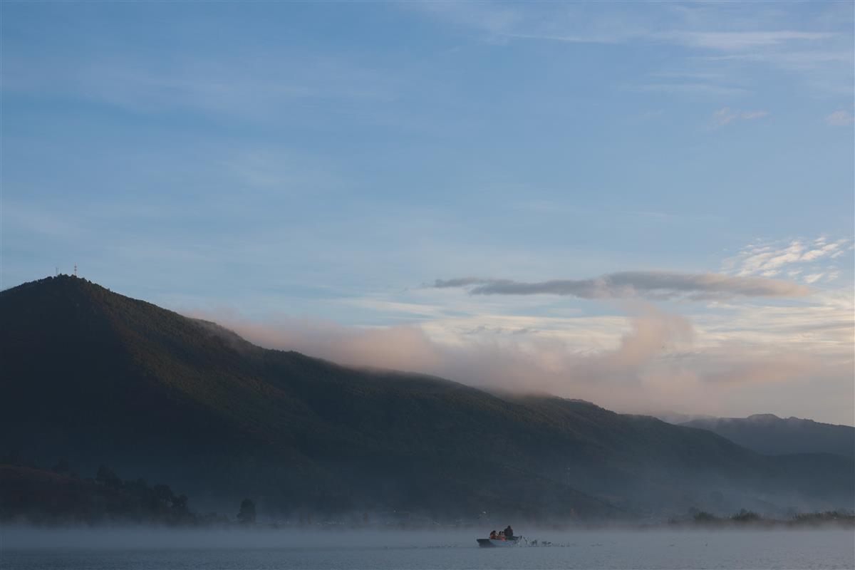 晨雾缭绕的泸沽湖面之上,一艘猪槽船静静浮于水间,船身小巧,在烟波浩渺中似一叶孤舟。