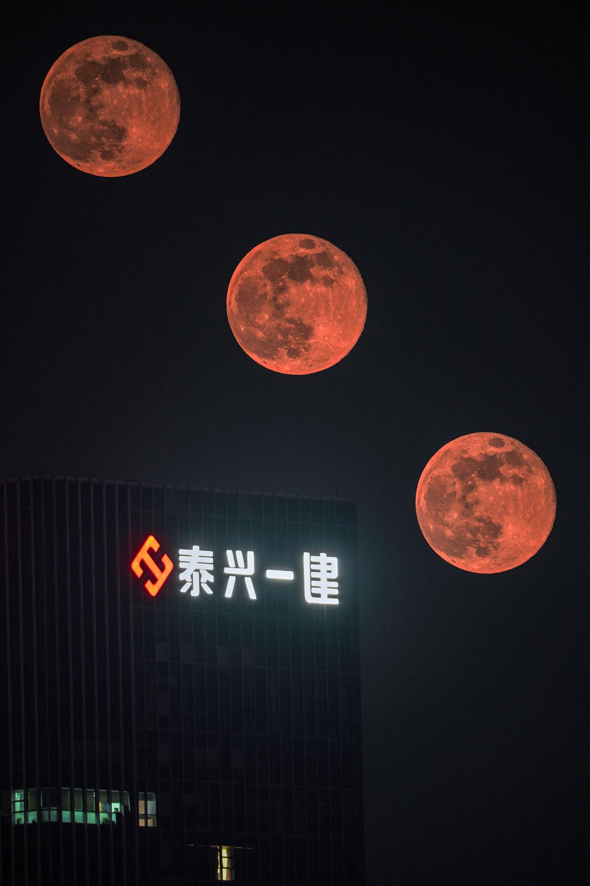 利用多重曝光技术记录2025年的最后一个超级月亮,从浦发银行授信客户泰兴一建上空跃升的时刻。
