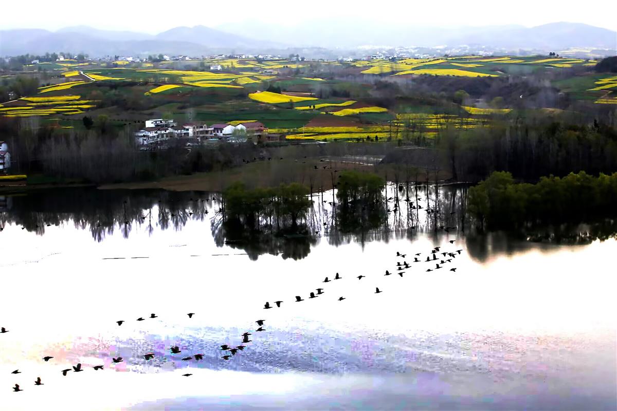 谠河水库上成群的鸬鹚飞过水面。