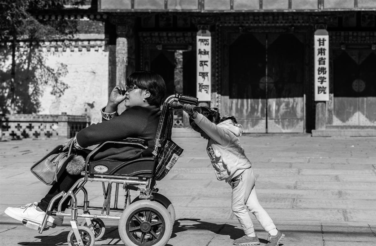 在甘肃佛学院庄严肃穆的门前,一个扎着马尾辫的小女孩,脸庞稚嫩却满是坚毅,正用尽全力地推动着坐在轮椅上的妈妈。她的步伐虽小却异常坚定,每一步都透露着对母亲深沉的爱与责任感,展现出一幅温馨而坚韧的画面。
