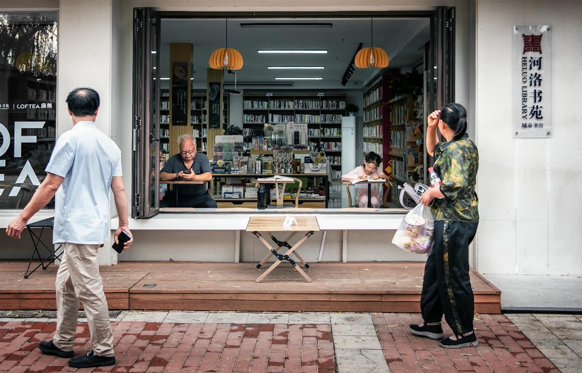 城市书房窗前,一位老人和一位儿童各自安坐,沉浸在自己的世界里。窗外是流动的街景和步履匆匆的行人,两位路过行人,目光各自看向窗内这对老少。窗内窗外间像是有着一道无形的界限,隔开了外面的喧嚣,框住了一方宁静的书香,阅读的感染力悄然流淌。