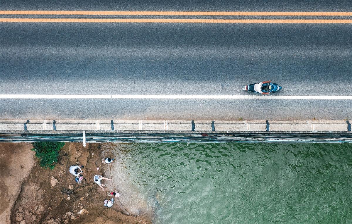 本作品垂直俯拍黄河孟津段,画面被大桥切割为上下两重空间:上方桥面车流如光轨穿梭,下方河滩上一家老少赤脚戏水,溅起晶莹水花。夏日河水因生态治理清澈见底,黄沙与碧波交织成天然画布,人类活动与自然水文在垂直视角中形成趣味对话——既有母亲河的壮阔奔涌,亦有市井生活的轻盈诗意,展现黄河流域生态改善后“人水相亲”的生动细节。