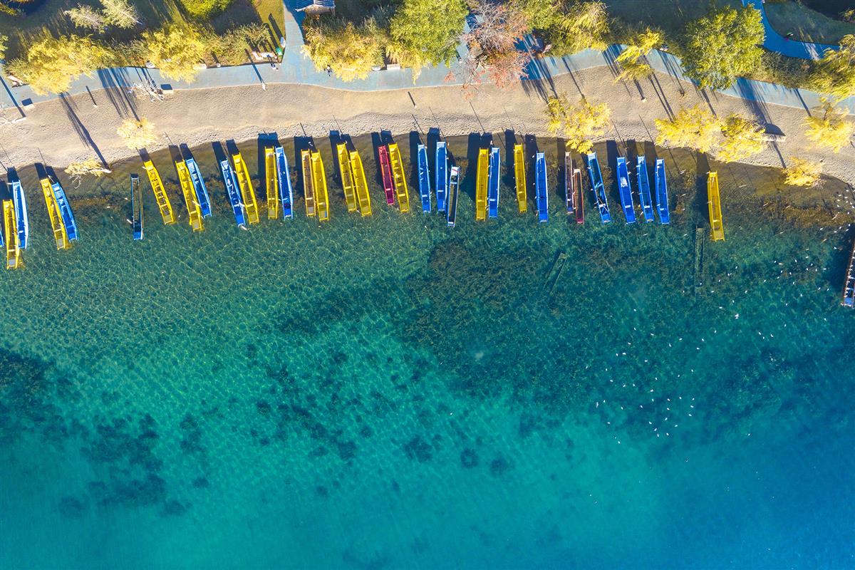 丽江泸沽湖的水是透亮的玻璃镜,能映见湖底石纹;岸边的黄蓝木舟是打翻的调色盘,在沙岸与鎏金树影间铺展成撞色的鲜活。清透蓝波上,红嘴鸥的白影似散落的星子,扑棱着把秋的灵动,揉进这高原湖畔的色彩诗行里。