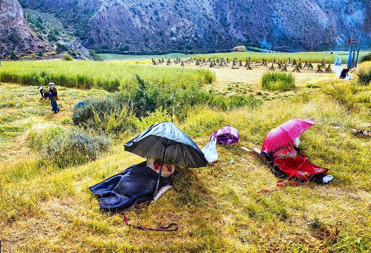 2024年8月30日的西藏昌都左贡县进入青稞收割季,妇女们把孩子安顿到田间地头后,立即进入到抢收劳作中。