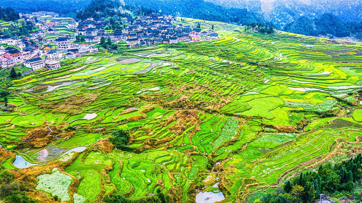 春风吹拂梯田绿