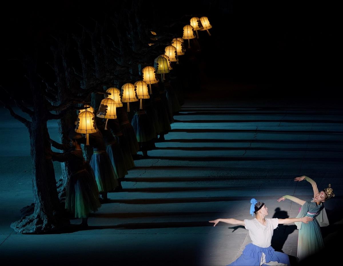 敦煌爱情故事舞台剧,暗绿的舞台背景光里只有一排黄灯,衬托出焦点舞者的舞姿神态,对角构图。