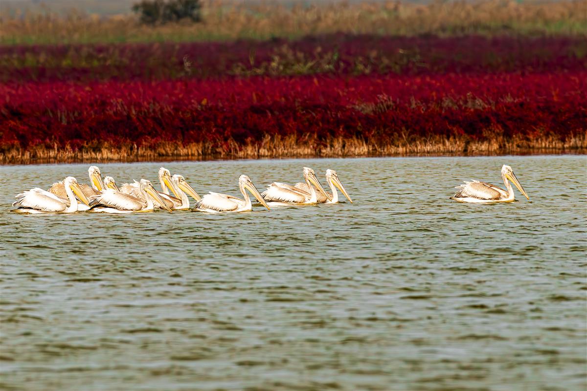 卷羽鹈鹕,国家一级重点保护动物。黄河口是东北亚和环太平洋鸟类迁徙的重要停歇地和越冬地,每年冬春时节,都有数百万只候鸟往返经过黄河入海口,并在这里休憩、觅食、完成补给,场面宏达,蔚为壮观。