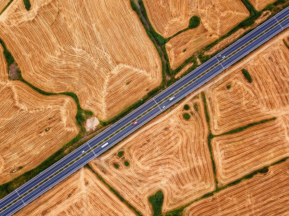 夏收时节,桥下的滩涂里,麦子已经被收割完。从空中俯瞰,仿佛是一幅美丽的大地画卷。