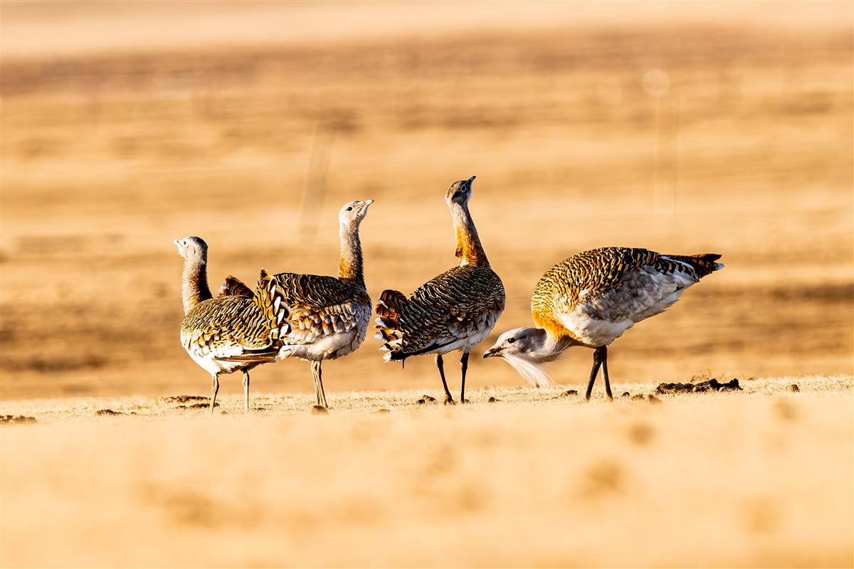大鸨,国家一级重点保护动物。4月初,内蒙古多伦草原寒冷刺骨,往北迁徙的大鸨,在此短暂停留、休憩,补充体能。