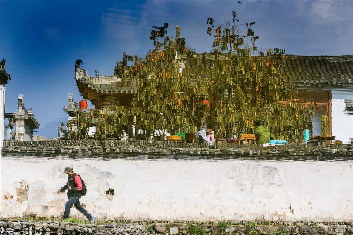 徽村果熟映塘秋,碧塘倒影漾温柔,檐间硕果垂金穗,徽韵藏秋不胜收。