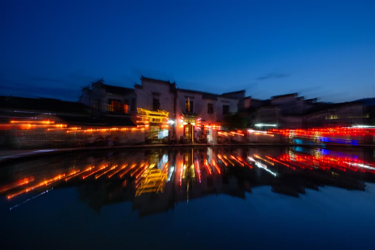 宏村蓝夜,灯影入塘,青瓦白墙浸在微凉夜色里,红灯映碧水,倒影晃流年,这是宏村独有的夜温柔。