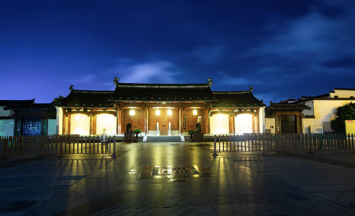 华灯初上染徽衙,夜色铺蓝映钓影,飞檐流彩承古韵,一竿垂钓,半盏灯明,皆是徽州夜的风雅。