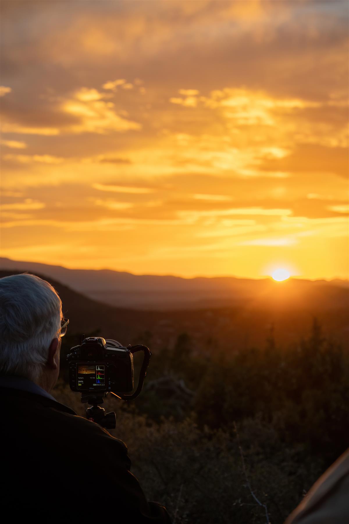 在美国凤凰城的黄昏时分,橙金色的夕阳将天际晕染成暖融的绒毯,远山在暮色里沉作淡墨轮廓。白发老者持相机静立,镜头对准将落的日光。这一瞬,他既是余晖的记录者,也成了黄昏里温柔的注脚。