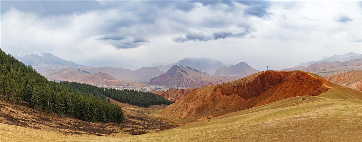 卓尔山巍峨耸立,丹霞赤壁与翠绿草甸交织,云雾缭绕间,宛如一幅雄浑壮美的天然画卷铺展在天地间。