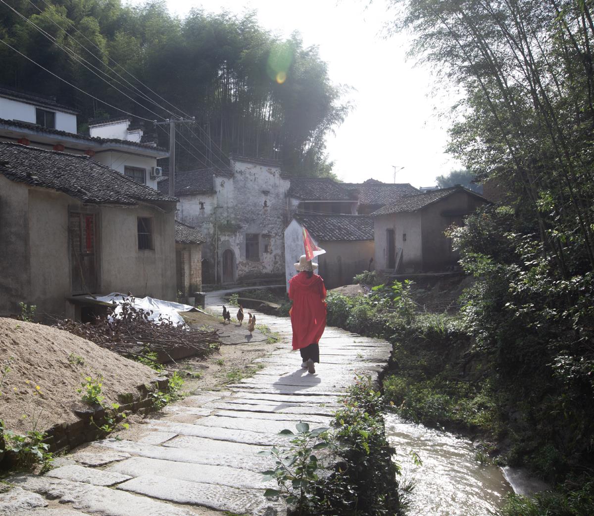 白墙黛瓦隐灵山,翠竹成林覆石径,佳人信步闲游,竹风拂衣,黛瓦含情,一步一景皆是徽村清雅韵致。