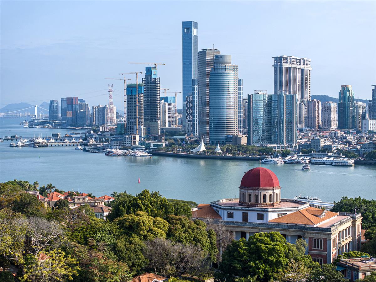 2025年2月19日拍摄于鼓浪屿,鼓浪屿红顶老建筑隐于绿树,鹭江游船往来,对岸厦门本岛摩天楼林立,塔吊与跨海桥错落,新旧风貌交融成厦门城景。