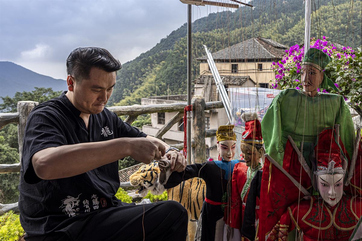 2023年10月2日拍摄于浙江松阳陈家铺村,木偶表演者在演出之前缝补木偶衣袖。