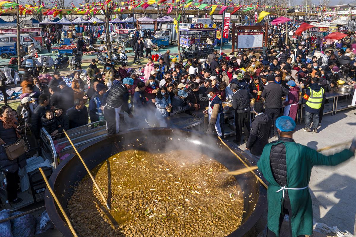 南佐大集上,巨型铁锅冒着热汽,食材在大铲翻动里飘香。攒动的人群裹着冬衣,围在摊位前候食,彩幡下的集市烟火,裹着热闹的年味。
