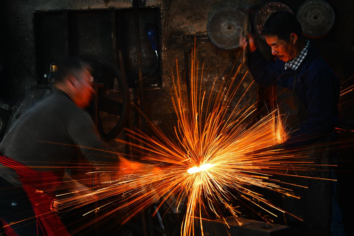2023年11月19日,浙江省永康市世雅村一间普通打铁店铺,62多岁俞师傅和他的伙伴,正在专心打制农用锄头,铁花璀璨 。俞师傅打铁45年,带过徒弟,手艺精湛,铁器产品深受当地百姓喜欢。是永康市非物质文化遗产“永康打铁技艺”代表性传承人。