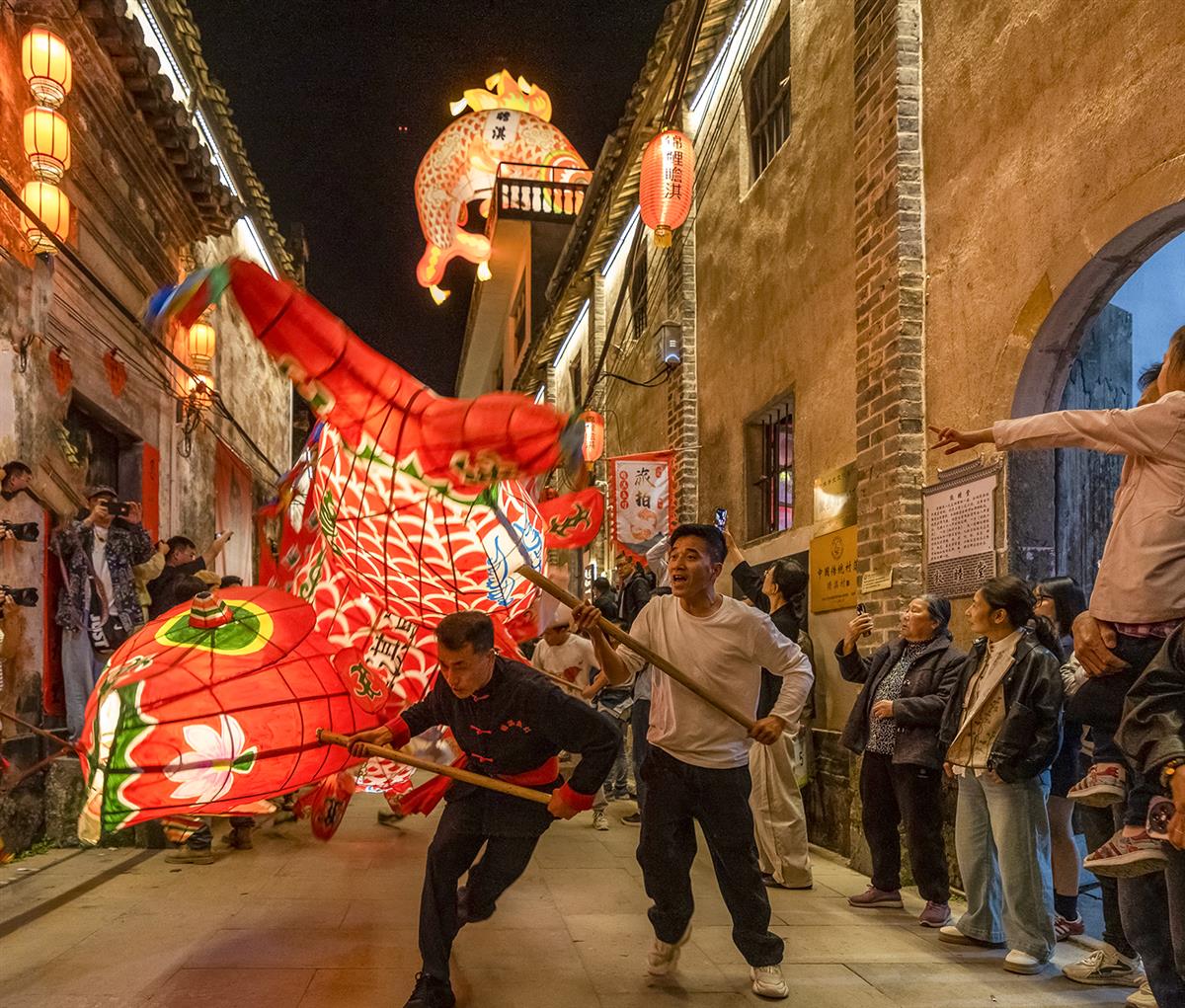 夜色里的徽州古巷,红绸鱼灯随杖舞动,鳞光与灯笼暖光交织。村民捧灯穿梭,街坊檐下围观,老墙新影裹着烟火气,是瞻淇村独有的民俗热闹。