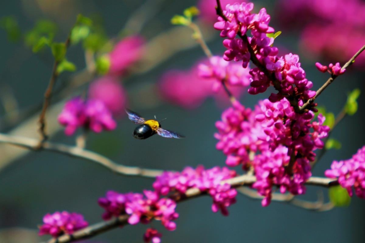 图片捕捉了一位春日信使的生动瞬间——一只带有醒目黄黑条纹的木蜂,正振动着翅膀,似一道掠过镜头的微小闪电,精准地飞向一片绚烂盛开的紫荆花丛。它的黑色身躯与头部耀眼的金黄色绒毛,同粉紫红色的花朵形成了鲜明而温暖的对比。由于翅膀高速振动而产生的动态模糊效果,赋予了画面灵动的生命力。运用了浅景深的拍摄手法,将焦点清晰地对准了蜜蜂与近处最繁密的花簇。