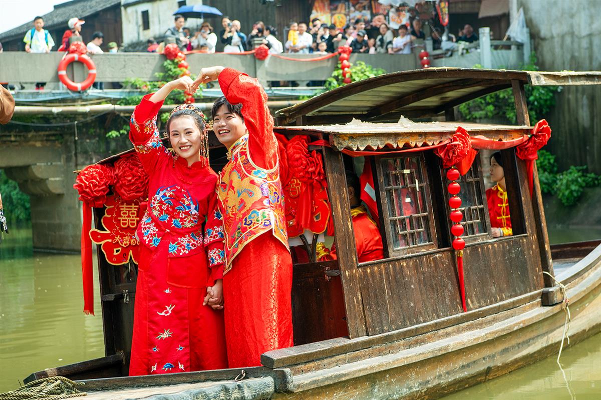 2023年4月15日,浙江省兰溪游埠古镇,一个典型的江南古镇,传统文化活动盛名,文物古迹颇多。龙灯、花灯舞狮等村村都有,宗祠、庙宇、牌坊、鼓楼等多数保存完好。横贯镇内的游埠溪上有清代所建的"太平桥"、"永安桥"、"永济桥"、"永福桥"、"潦溪桥",总称"五马归槽",堪称一绝。水上迎亲喜洋洋,吸引四面八方游客观赏。旅游业兴起,古镇游埠的面貌焕然一新,呈现出蓬勃发展的新景象。
