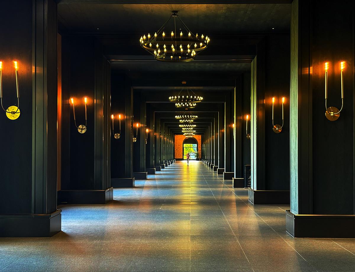 2025年6 月6日,浙江省金华市婺城区长山乡两头乌国际牧场。这是一条极具纵深感的长廊,深色木质立柱与墙面构筑出庄重的框架感,两侧壁灯透出暖黄光晕,与天花板上错落的金属吊灯形成层次分明的光源。光滑的石质地面倒映着光影,从近景的冷调灰蓝逐渐过渡到尽头的暖金光亮,长廊尽头的红砖与绿植成为视觉焦点,一个行人隐约走来,冷硬的建筑线条与柔和的光影交织,营造出复古奢华又带有些许神秘的氛围。