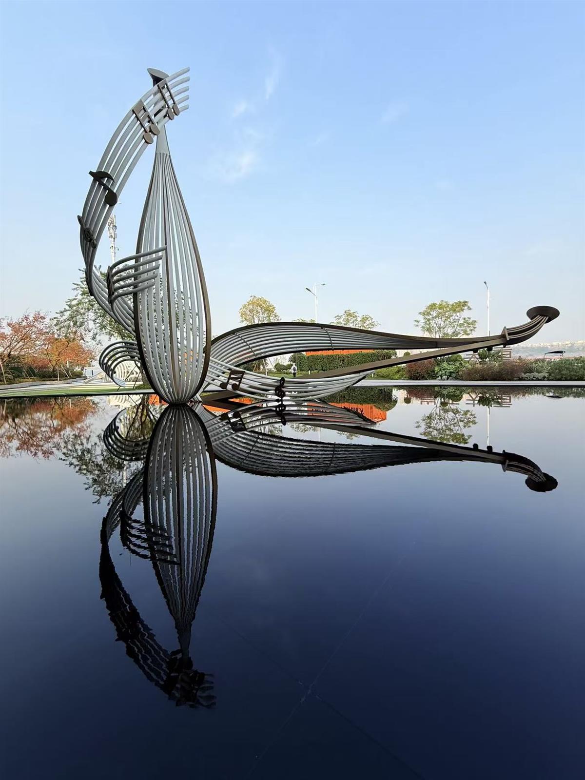 在重庆大渡口大滨路一个在建楼盘售房部门前,发现这个立于水中的雕塑,抽象化的琵琶及音符,寓意大渡口作为音乐半岛所赋予的音乐艺术装置之一。
