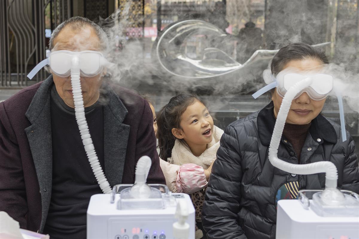 2025年12月6日,四川省宜宾市,社区进行免费护眼活动,两位老人体验眼部SPA,小孙女好奇地观看。