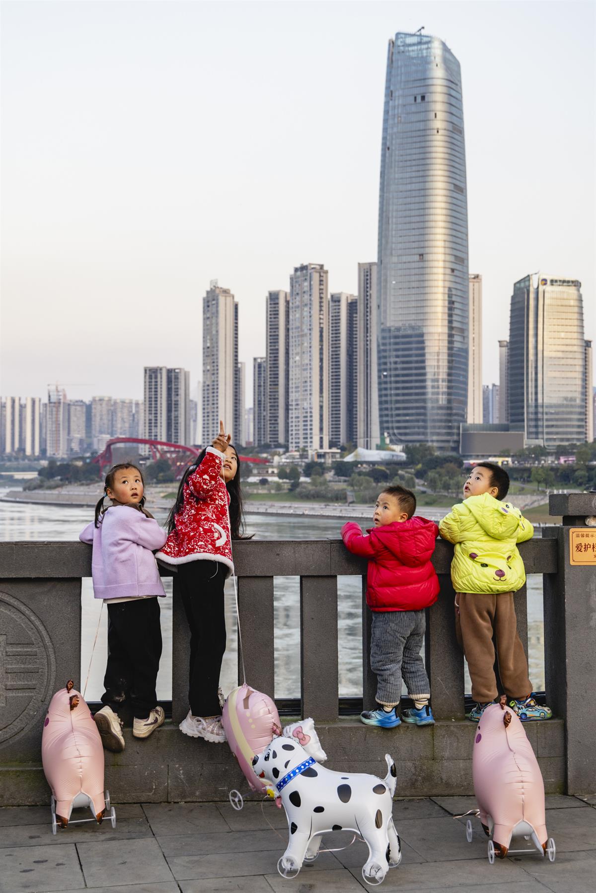 2025年11月15日,四川省宜宾市,几个带着玩具气球的小朋友被天空中不知什么物体所吸引。