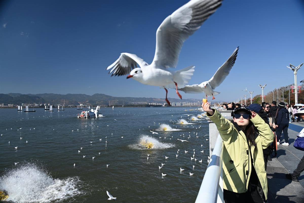 2025年1月7日下午,一拨又一拨的游人,高高举起手中的蛋糕,大声呼唤着红嘴鸥,吸引来一两只、三五只鸥鸟前赴后继地飞来啄食。