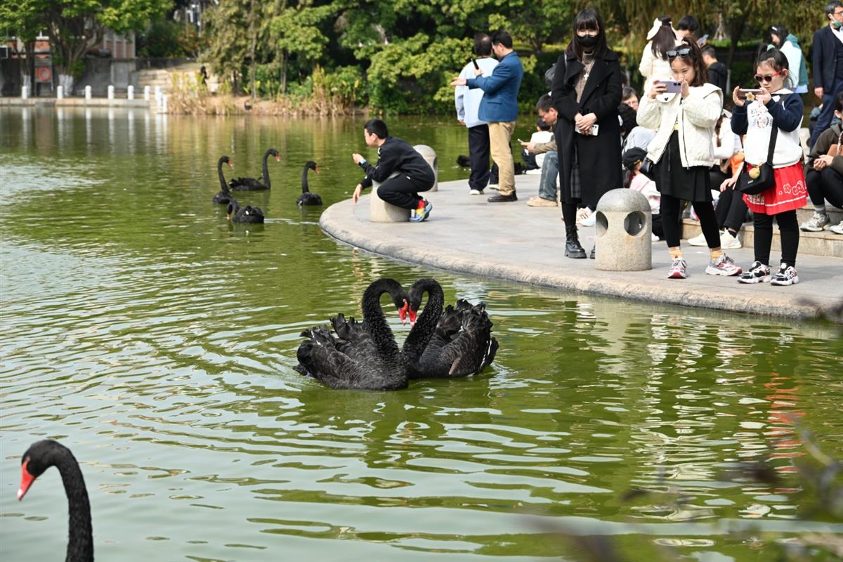 2025年2月19日下午,厦门大学美丽的芙蓉湖畔,十几只黑天鹅优雅地游弋着。它们时而低头觅食,时而展翅轻拍水面,溅起串串晶莹的水珠。最有趣的是,两只黑天鹅与游人们互动“比心”。