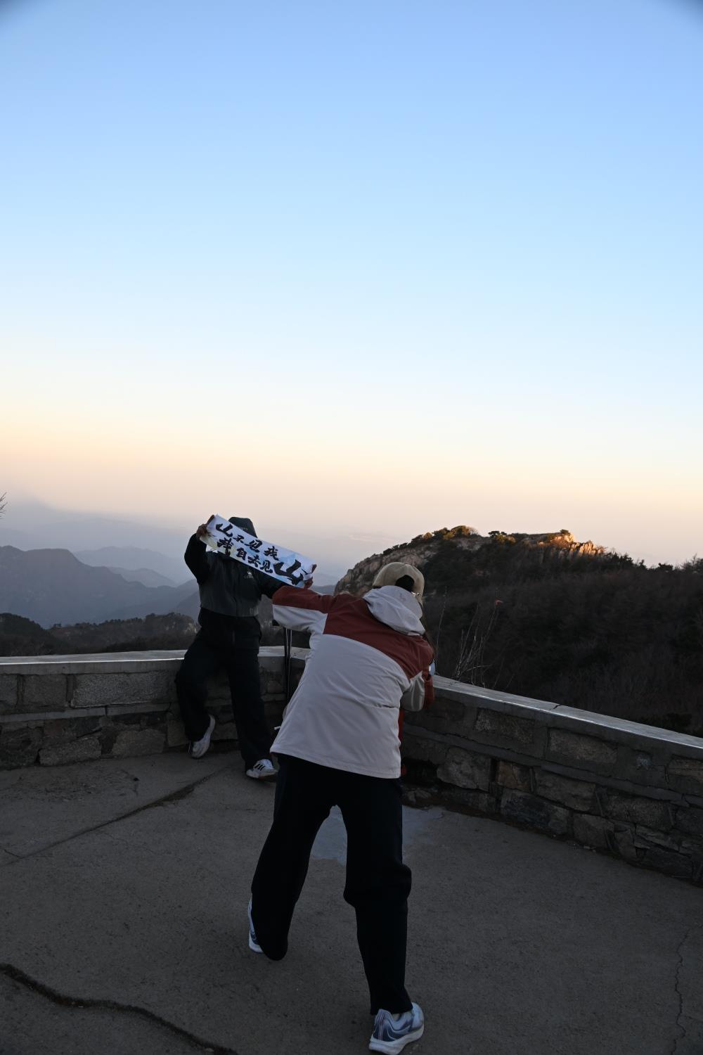 2025年11月29日早上,山东省泰安市泰山山顶。一对年轻恋人在观看泰山东方日出之后,打出“山不见我 我自去见山”的标语打卡拍照。