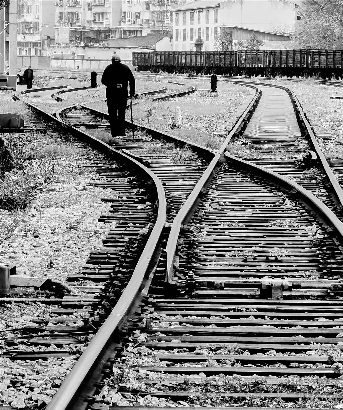 4月的早晨,东风汽车公司厂区内,一位耄耋之年的老工人正杵着拐杖,沿着铁轨缓缓行走。图中斑驳的铁轨,恰似老人一生奋斗经历的写照。但愿老人身体健康,像地上的铁轨一样,虽然老旧,但还可以不断向前方、向远处延申,远一点,更远一点......