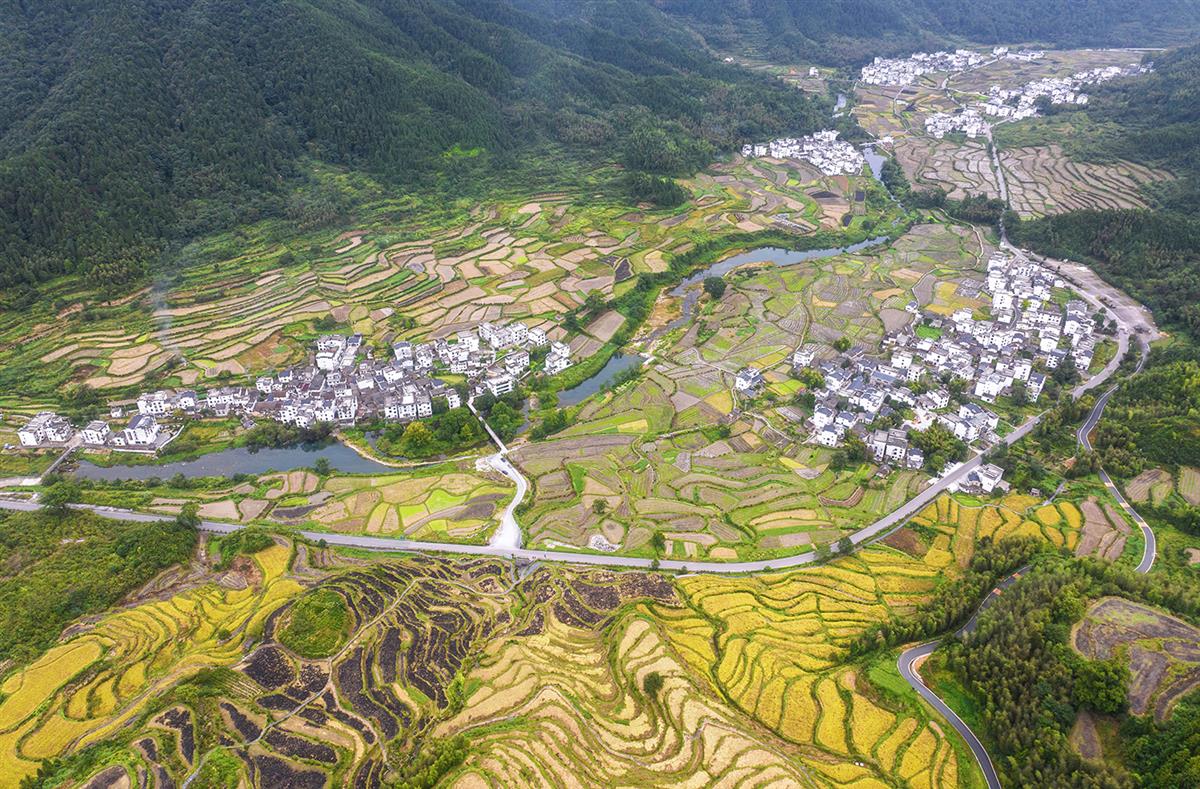 江岭梯田如大地指纹,黄绿稻浪层叠铺展,蜿蜒河流穿绕其间,白墙黛瓦的徽派村落散落如珠,公路银线串联山野与烟火,秋光里尽是天人共生的田园诗意。