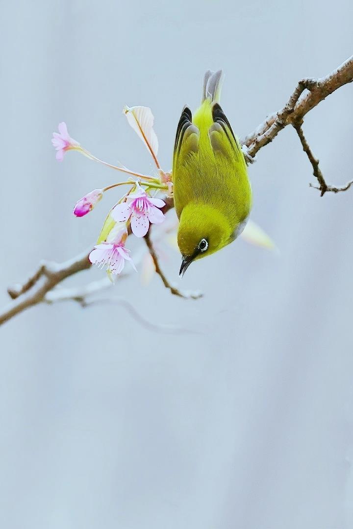 凛冬尚未散尽,寒风吹得枝桠轻晃,偏有几簇冬樱花执拗地绽着粉白,像揉碎的月光落了满身。而那只秀眼鸟,羽色青嫩得像初春的新芽,圆溜溜的黑眼珠嵌在绒绒的羽毛里,正歪着头啄食花蕊间的甜露。
