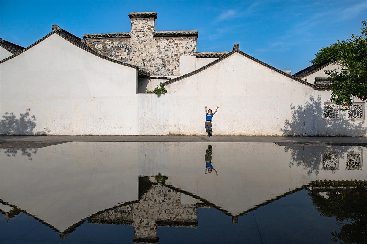 常州老街青果巷,一位儿童在老屋前玩耍。