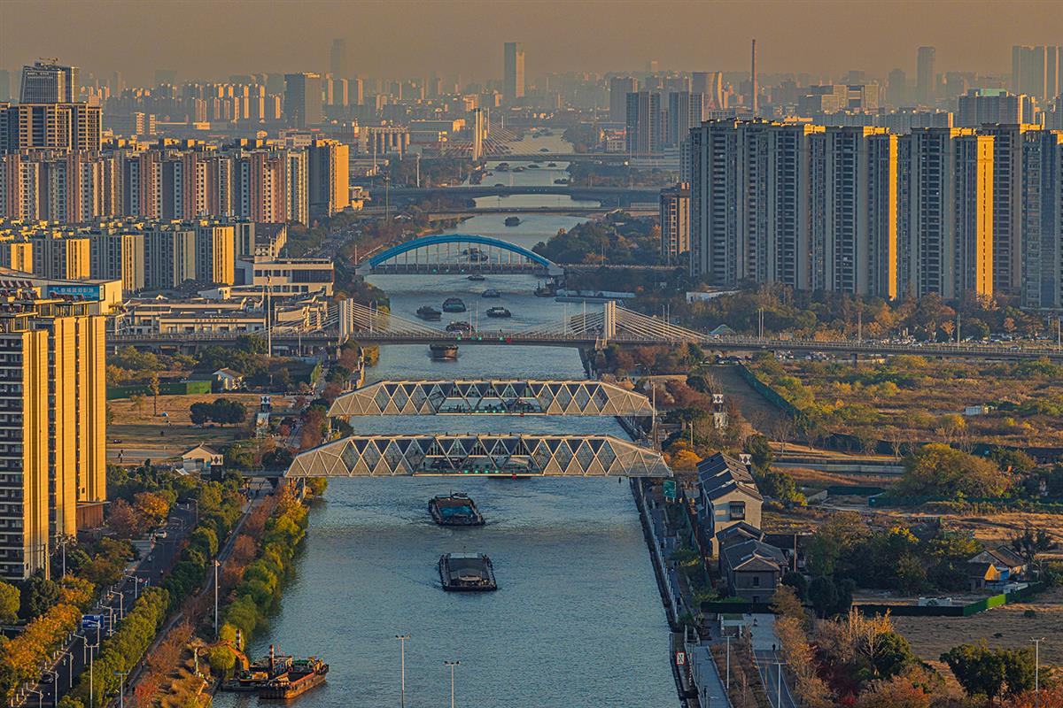 千年大运河两岸高楼林立,形态各异的大桥穿河而过,河面上船儿川流不息,一幅现代气息的画卷。