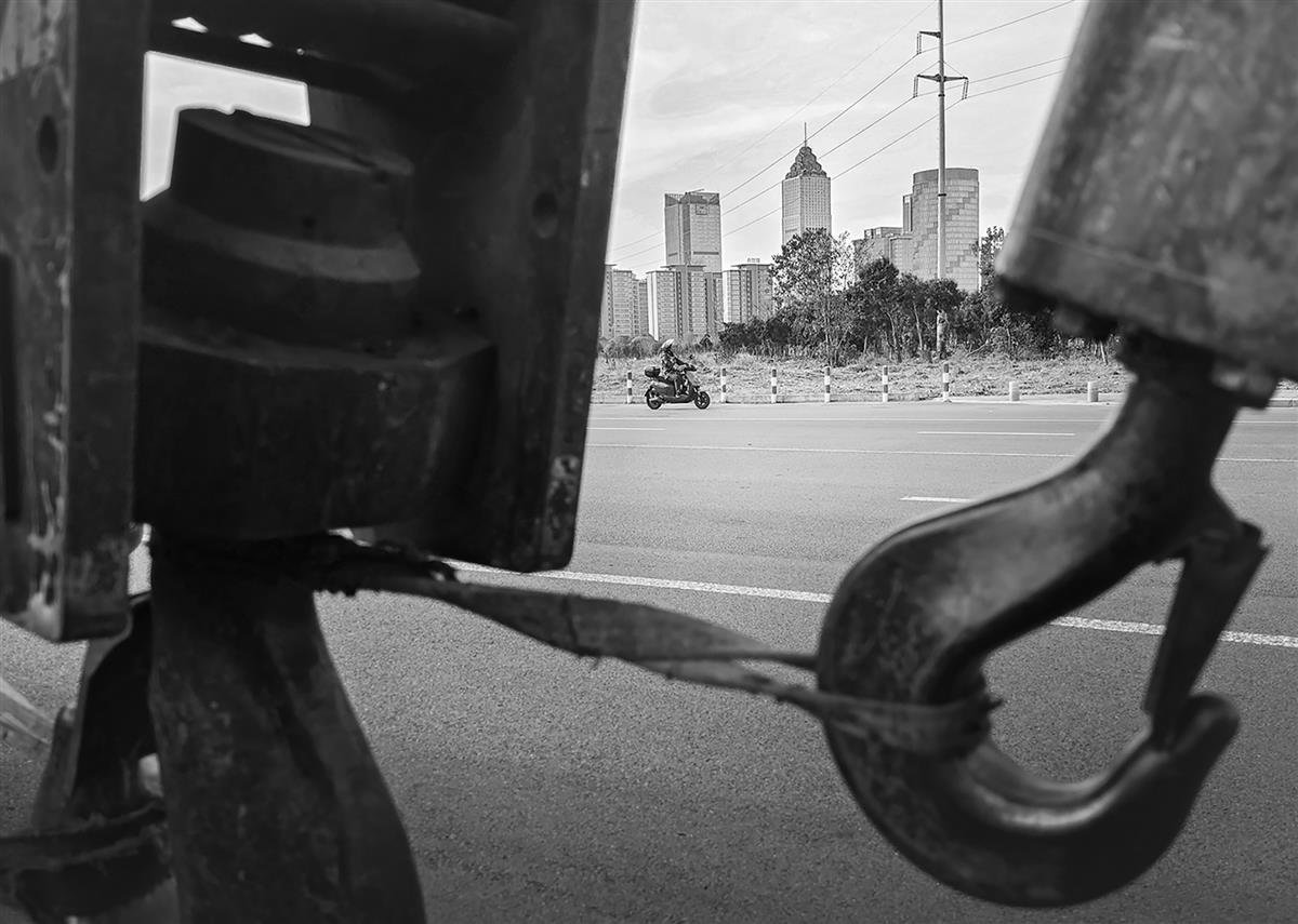 远处的城市和近处的塔吊反映出劳动人民的臂膀宛如塔吊,能创造一个新世界。