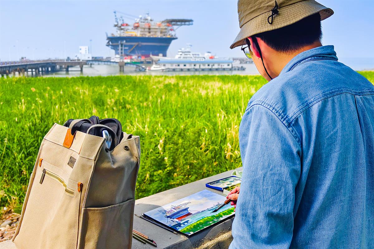 长江裤子港坝堤上,画家正在绘画江边美景。