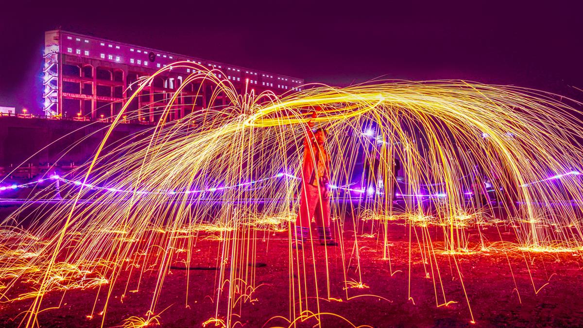 广西能源的桥巩电每年都会的电站的岛上,桃花节表演很多精彩节目,这是其中表演的打铁花绚丽场面。