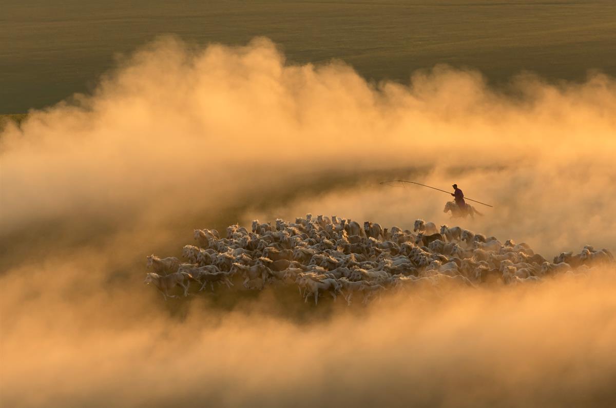 西乌旗草原的鎏金雾霭里,白马群化作白色浪潮翻涌,牧人策马引领的身影,尽显草原牧者的自信与白马文化的时代活力。
