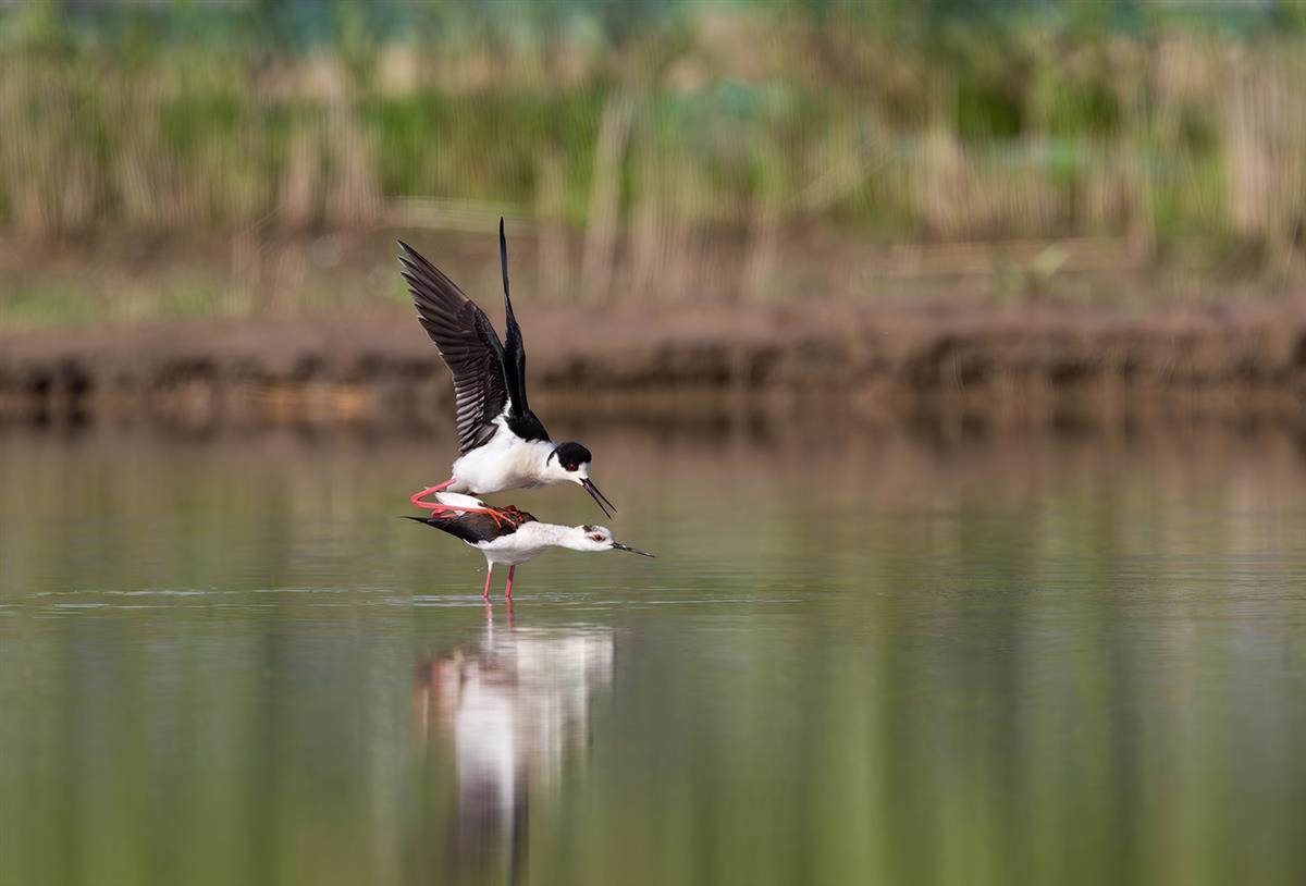水面上,两只黑翅长脚鹬在交配