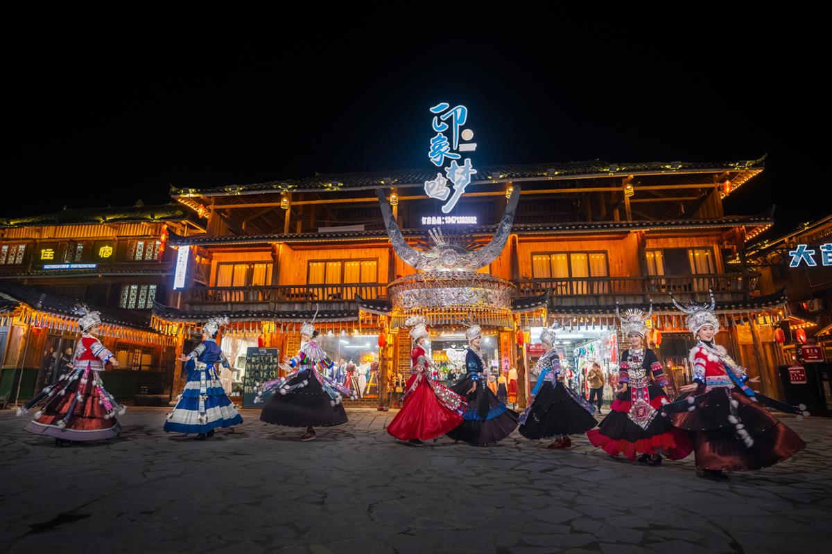 摄取于2025年的融水苗族自治县坡会,晚上的苗族姑娘在苗寨中,为游客们,跳起了热情洋溢的苗族舞蹈。