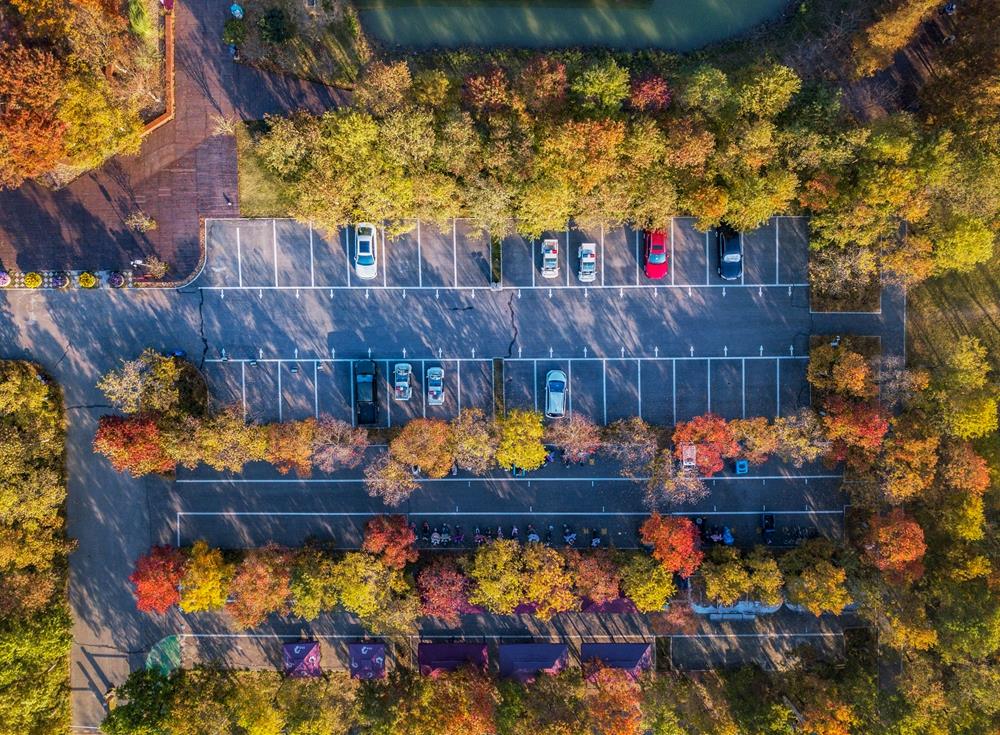 秋天的停车场,色彩斑斓,仿佛是一幅美丽的画。