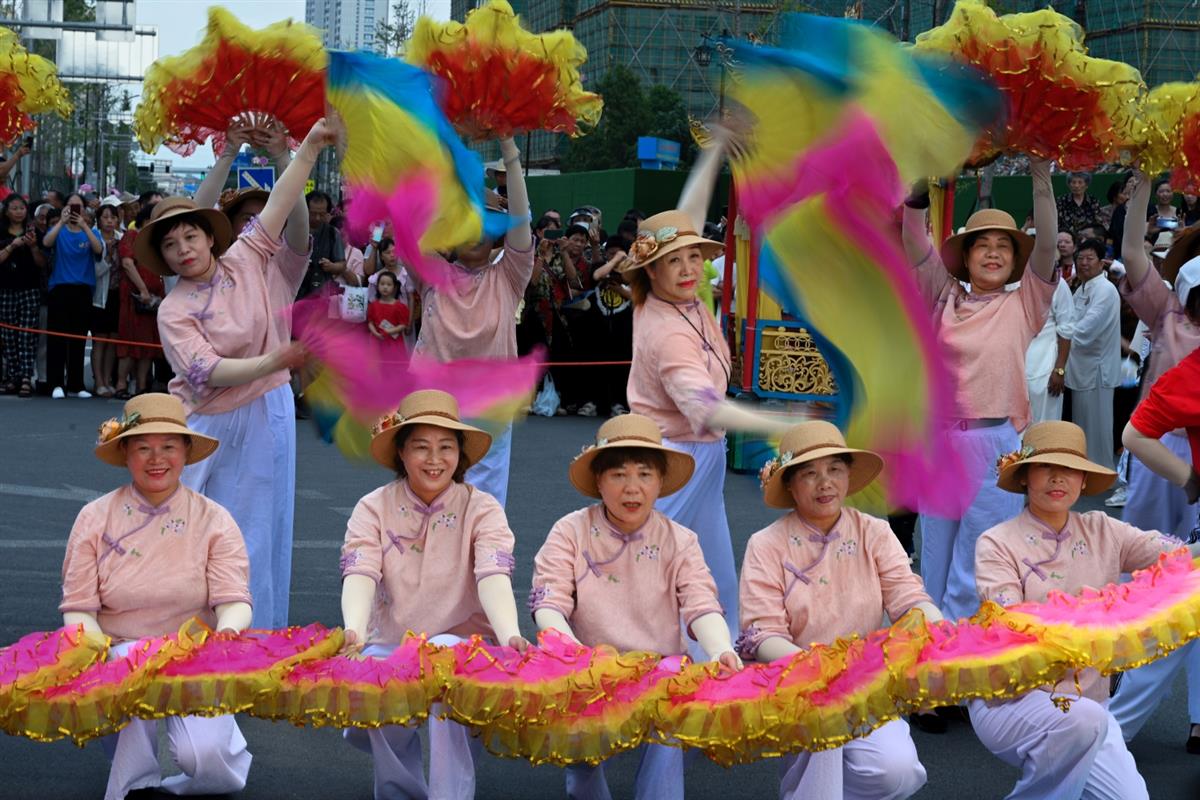 在椒江区开展的国家级非物质文化遗产-——送大暑船活动中,当地老年表演队表演扇舞。