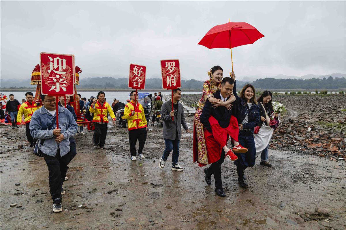 新郎背着新娘走在进村的路上,庞大的迎亲团在一旁护送。