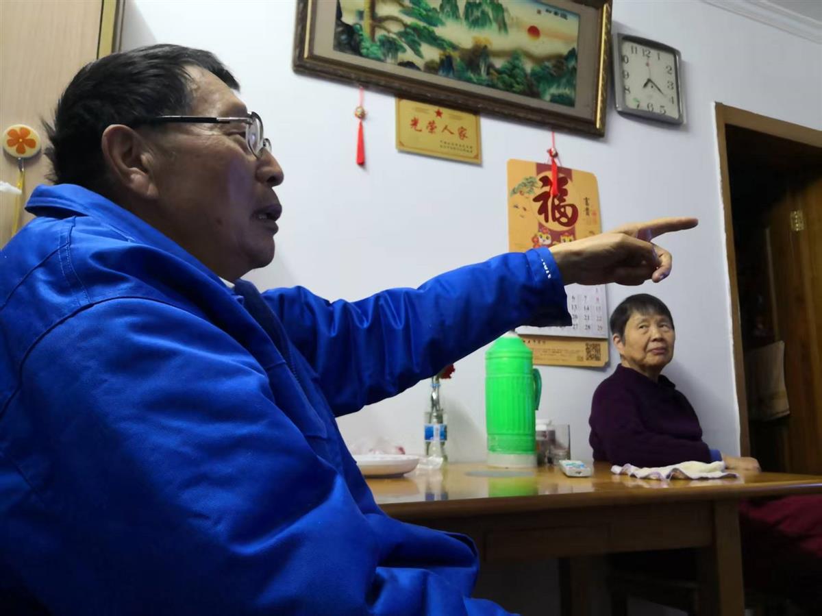 爸爸指着电视里的内容讲解给妈妈听,老有所乐