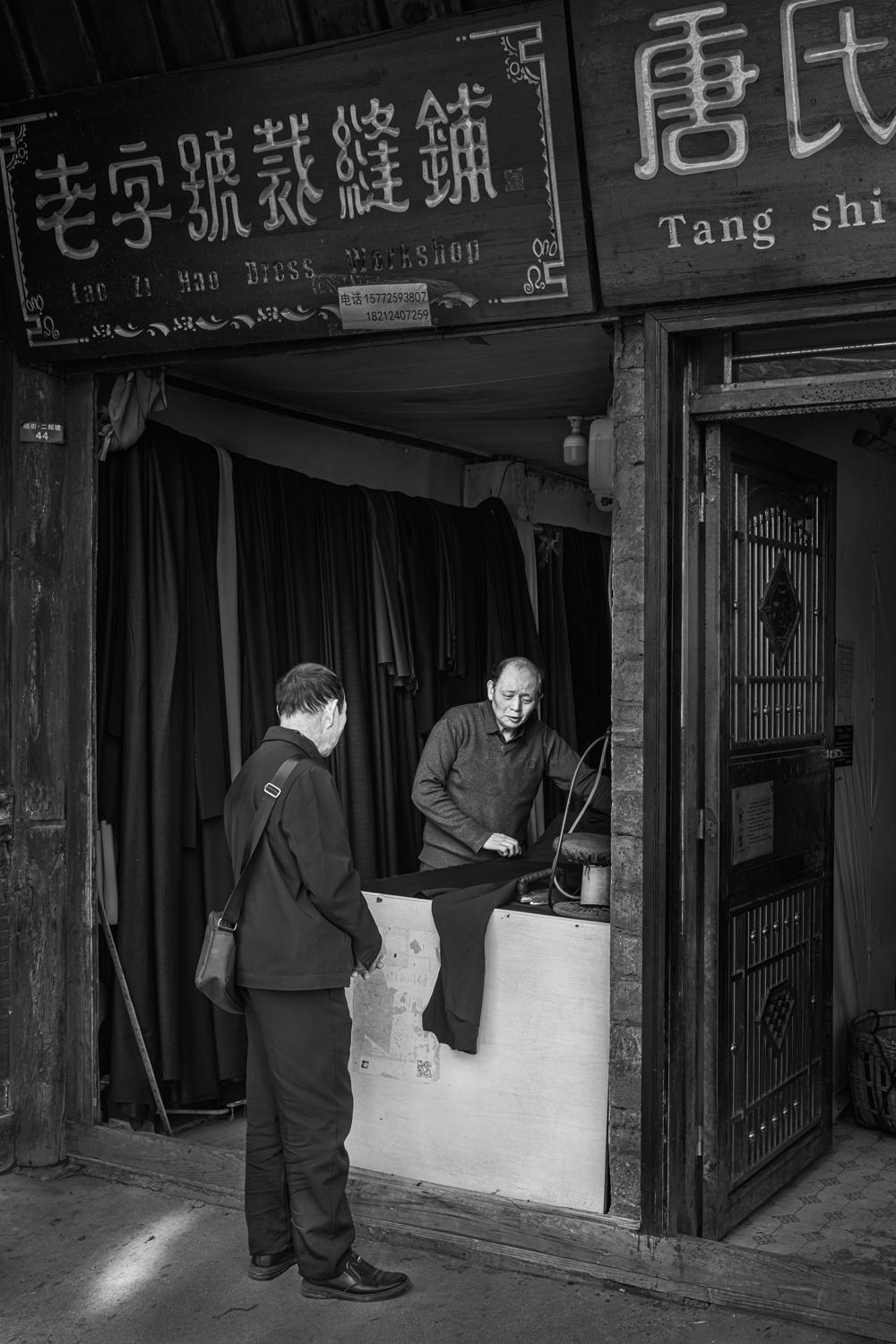 老街上的裁缝店师付,正在与客户冾谈生意。