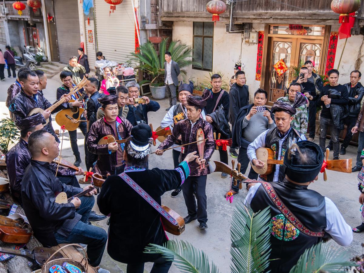 广西三江县梅林镇的苗族人,每年的农历2月2日,俗称龙抬头节,都会举行一场大型的苗族大歌和抢花炮等民俗活动。此图。此图为苗族大歌节,苗族民族乐器的乐手们在街边合奏的情景。